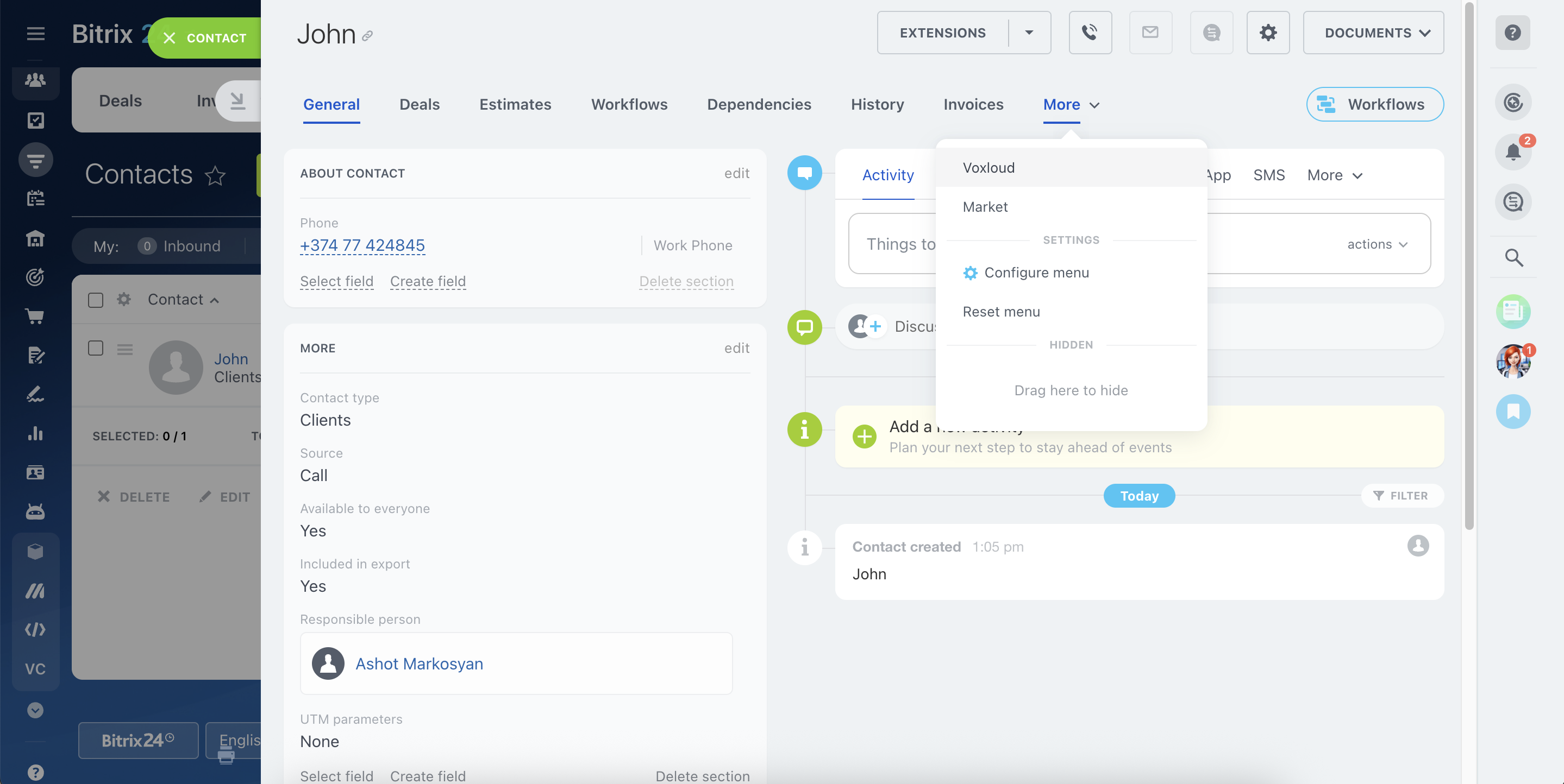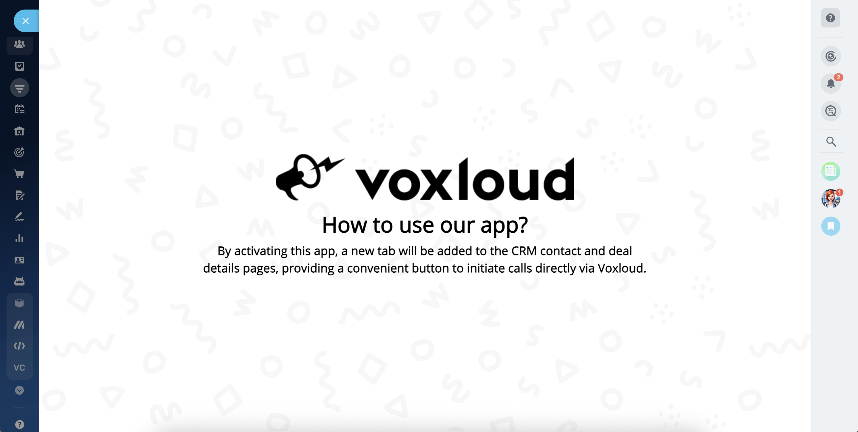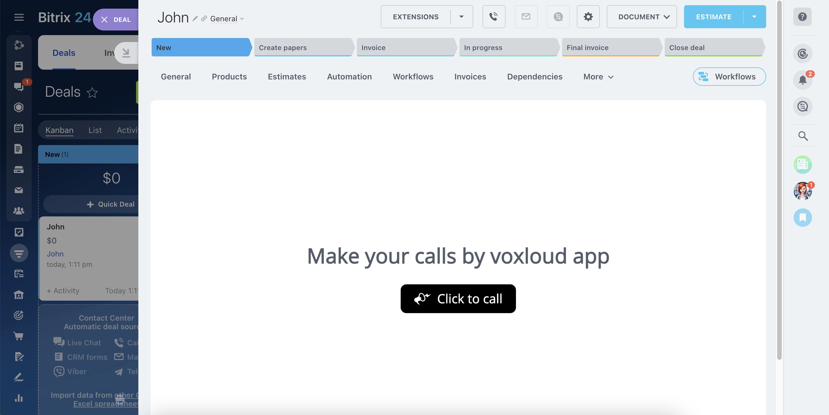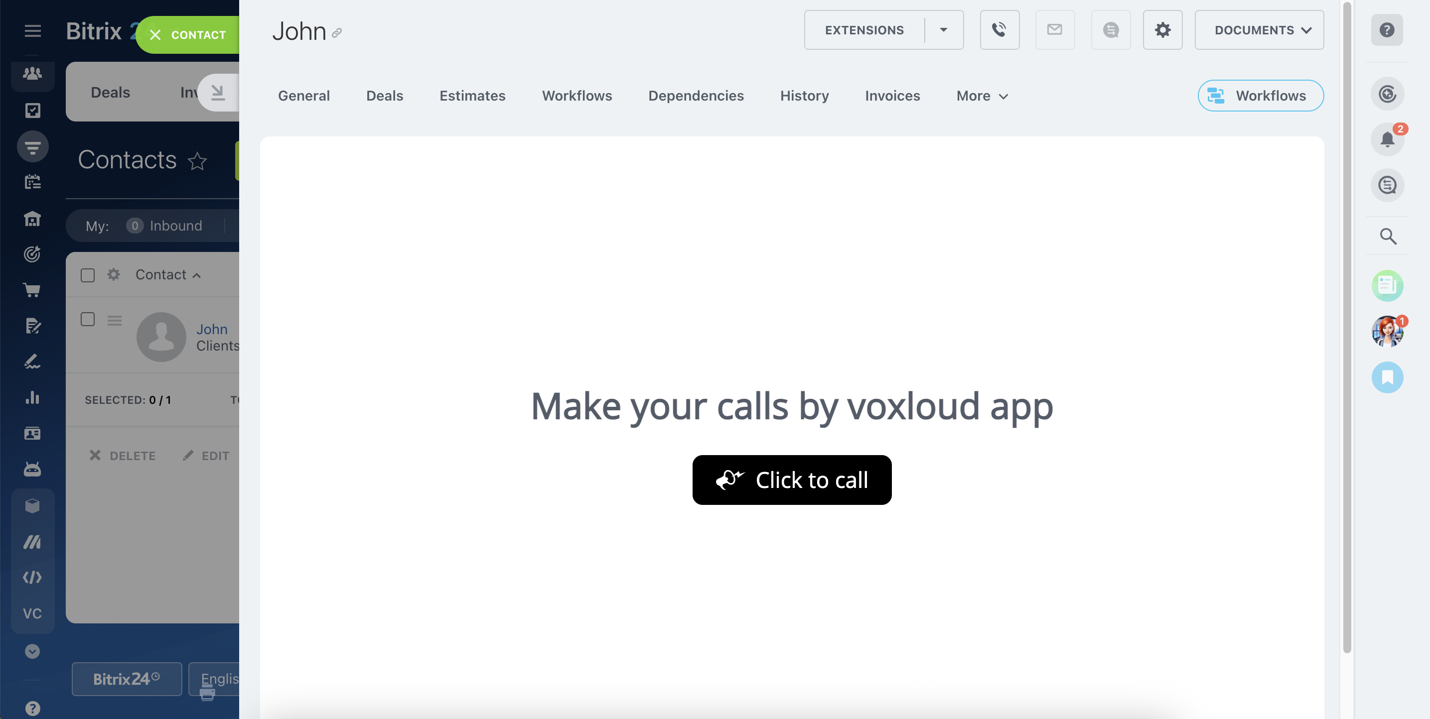The Voxloud Click to Call application allows users to initiate calls directly from Bitrix24, such as from contacts and deals.