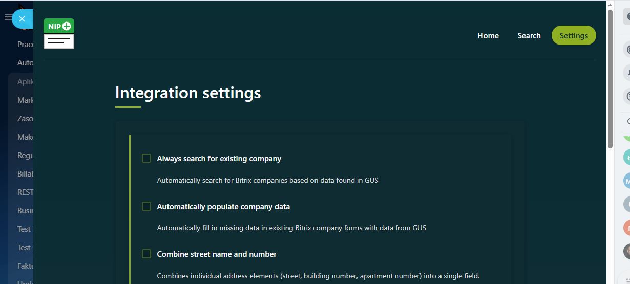This completely free application integrates Bitrix24 with the Polish Central Statistical Office (GUS) database, enabling users to search for company records, compare them with existing Bitrix24 data, and easily update company information. It supports manual searches from the main app panel, automatic matching from the company card, and includes a custom workflow activity for use across Bitrix24 CRM automation.