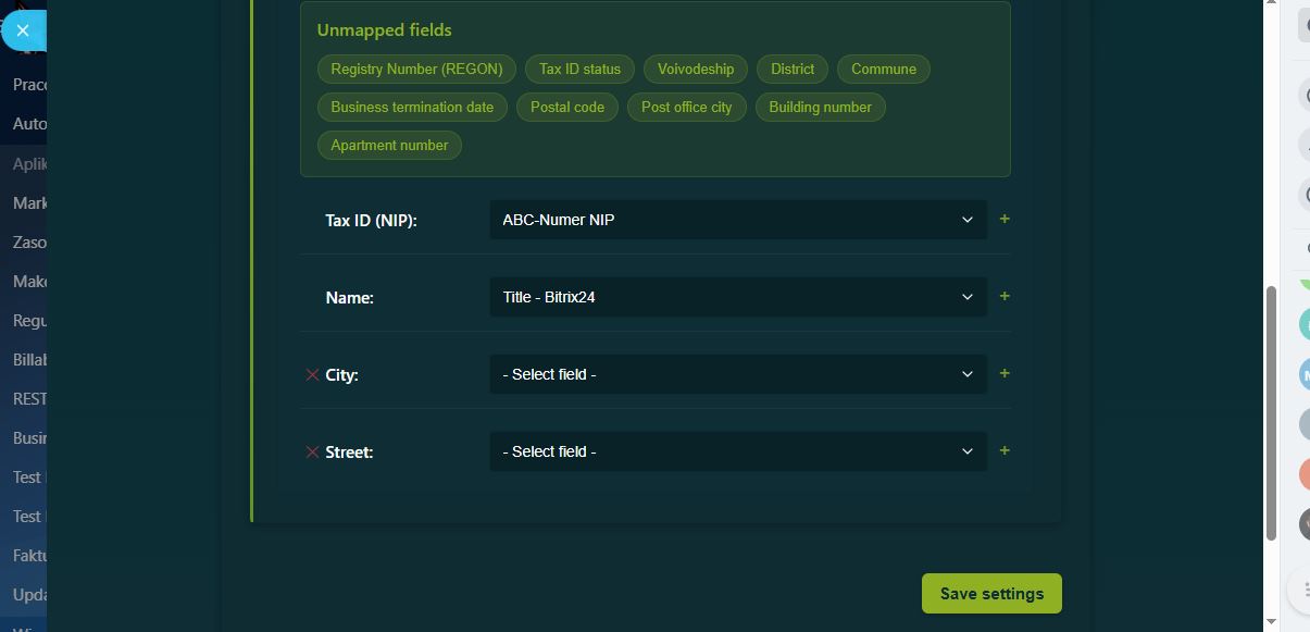 Field mapping settings to align GUS data fields with your custom Bitrix24 fields.