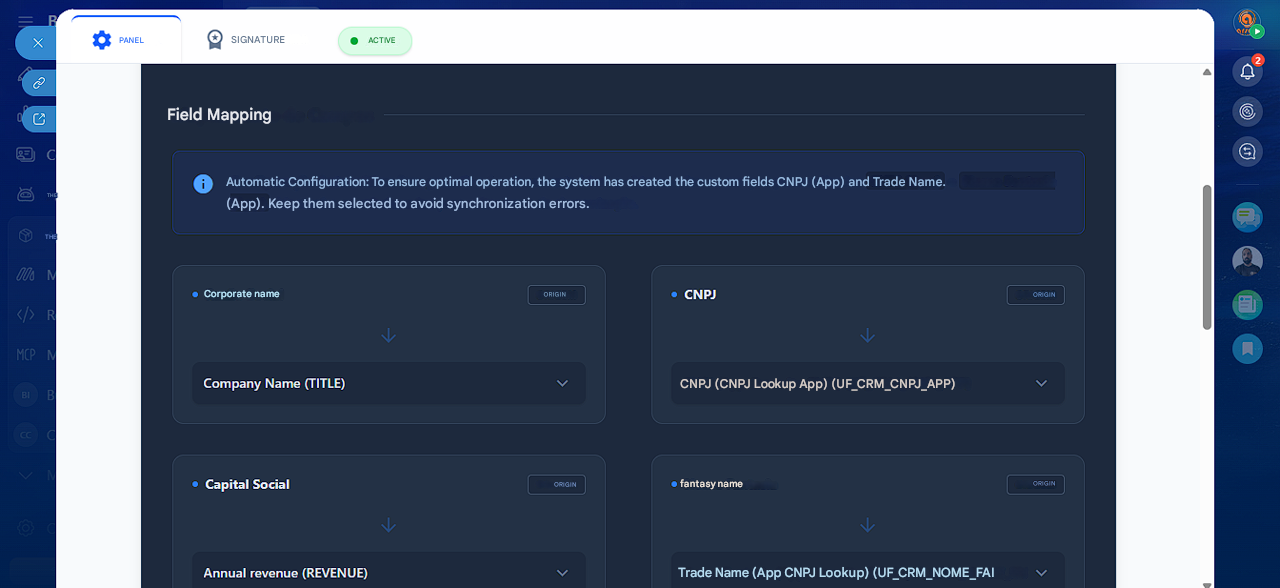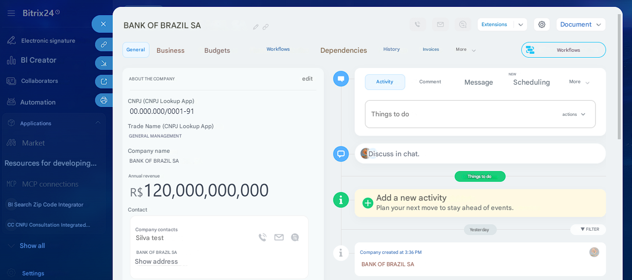 Key FeaturesOfficial Data Lookup: Updated information including Legal Name, Trade Name, Full Address, Main CNAE, Legal Nature, and Registration Status. Native Integration: Works directly inside the CRM record (Companies and Leads). Smart Mapping: The app automatically creates and maps all required fields in your Bitrix24 - no complex setup needed. Zero Infrastructure: No external servers or advanced configurations required. Install and start using it immediately.