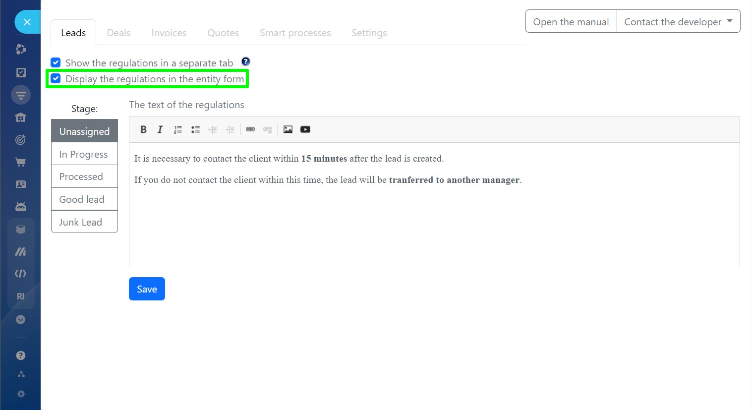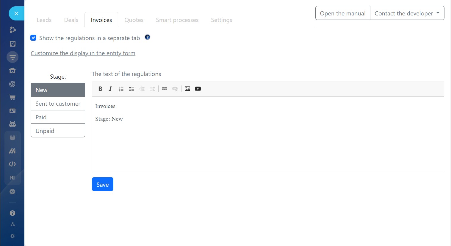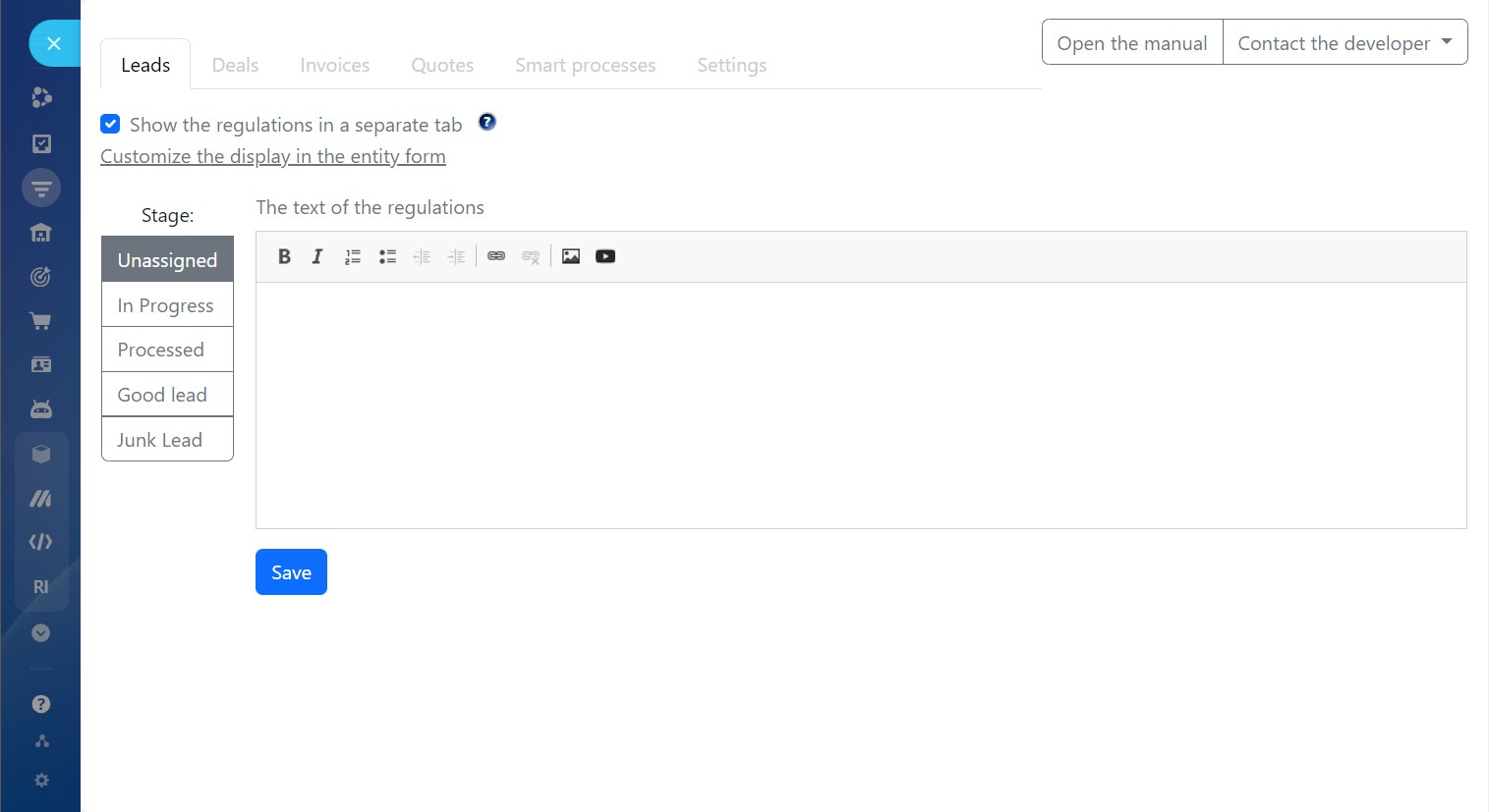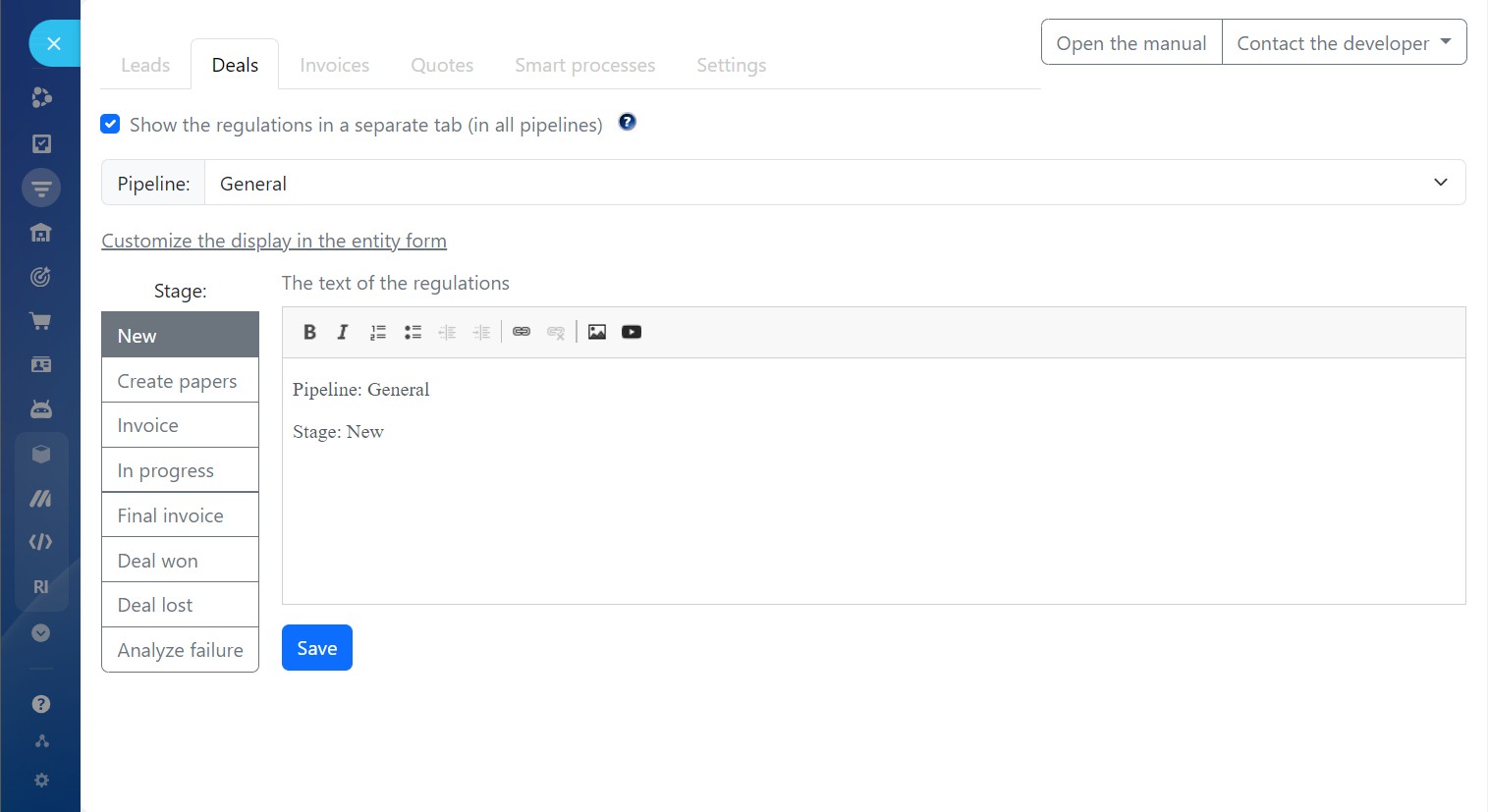 The application displays the regulations of work in the Lead entity form, Deals entity form, Invoices and Quotes entity forms, as well as the Smart Process entity form. You can set up specific regulations for each stage. You can add pictures and videos to the text of the regulations.