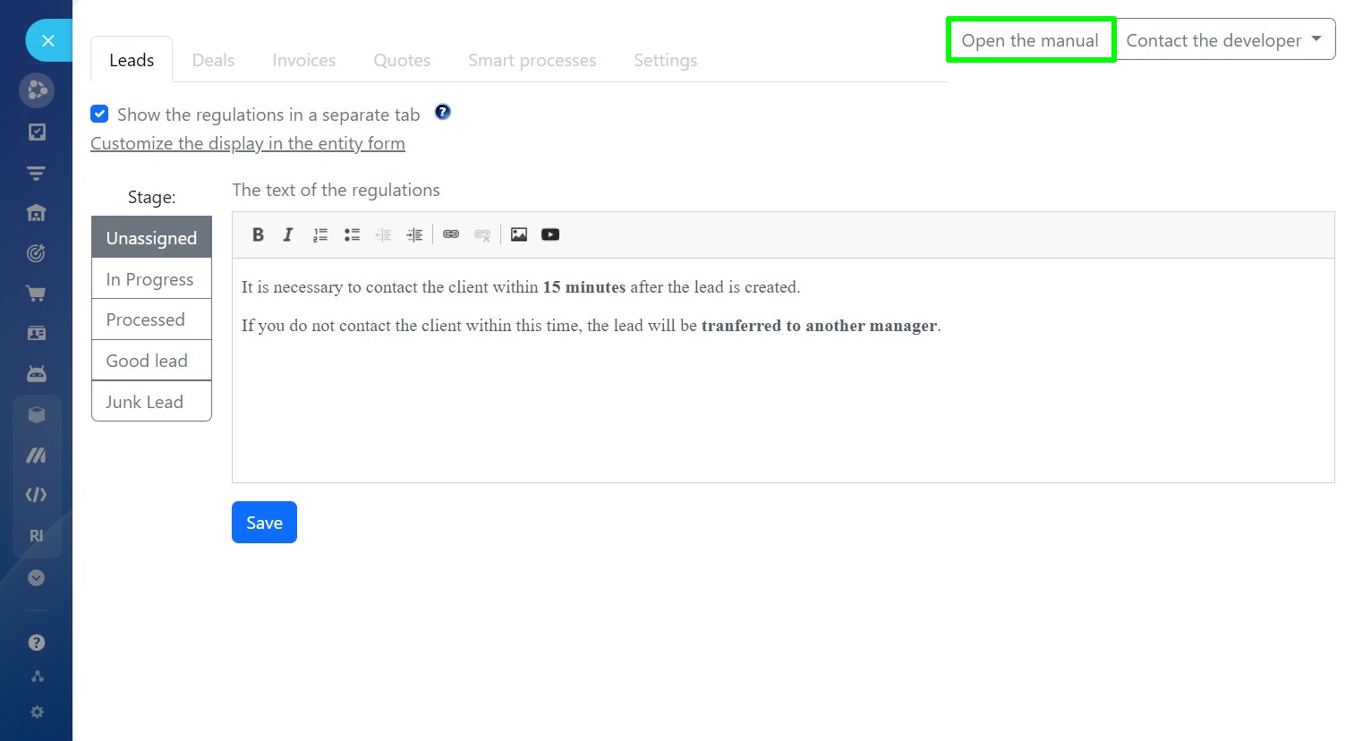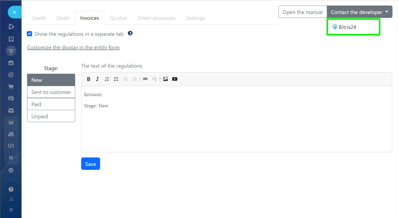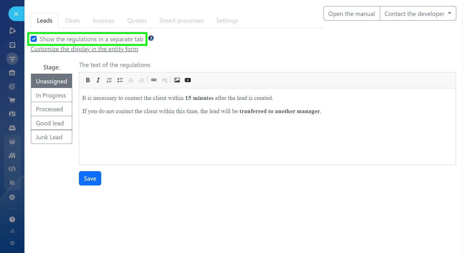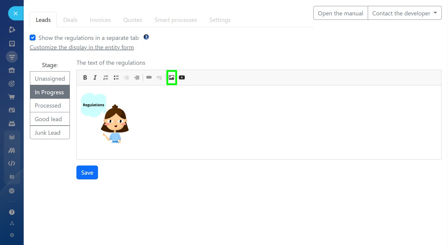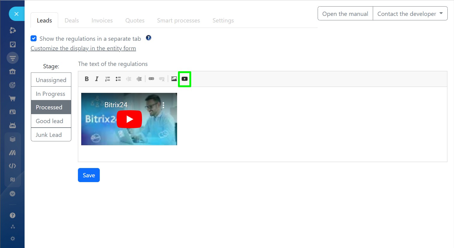 The application displays the regulations of work in the Lead entity form, Deals entity form, Invoices and Quotes entity forms, as well as the Smart Process entity form. You can set up specific regulations for each stage. You can add pictures and videos to the text of the regulations.