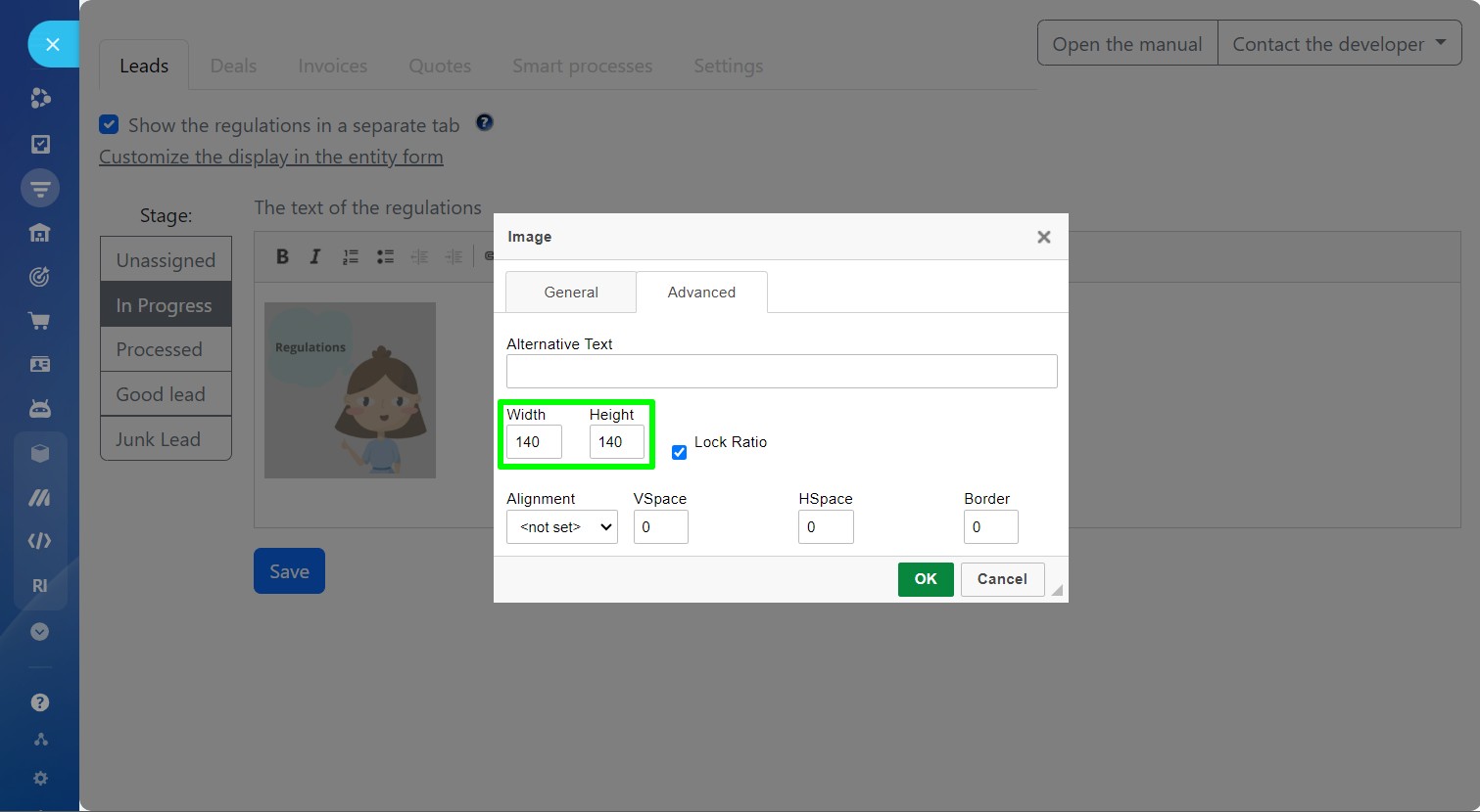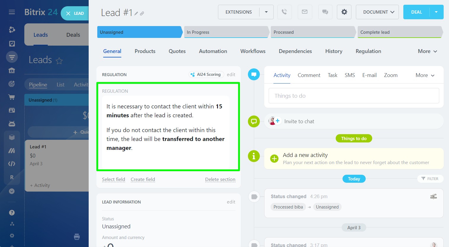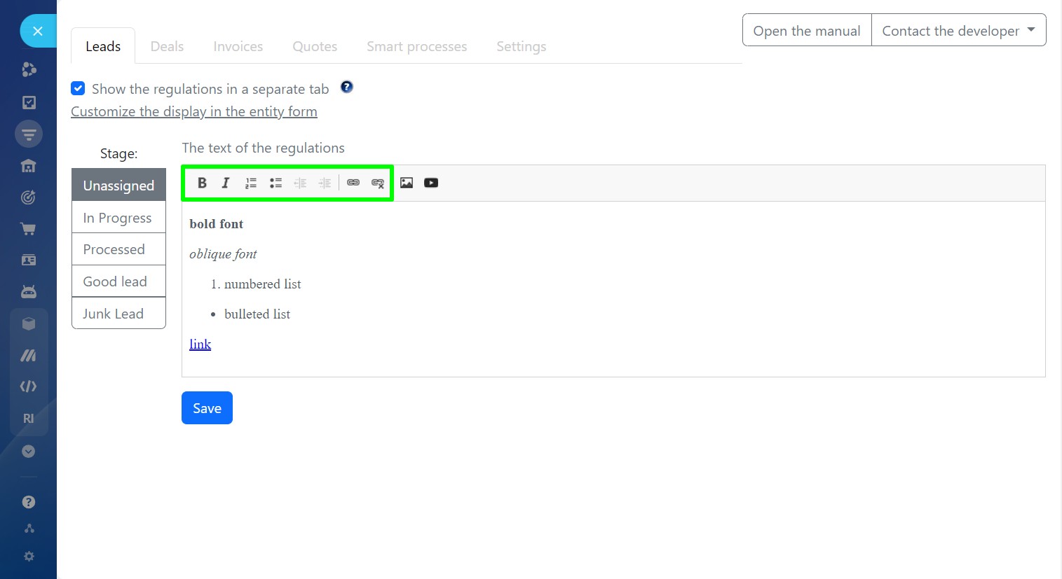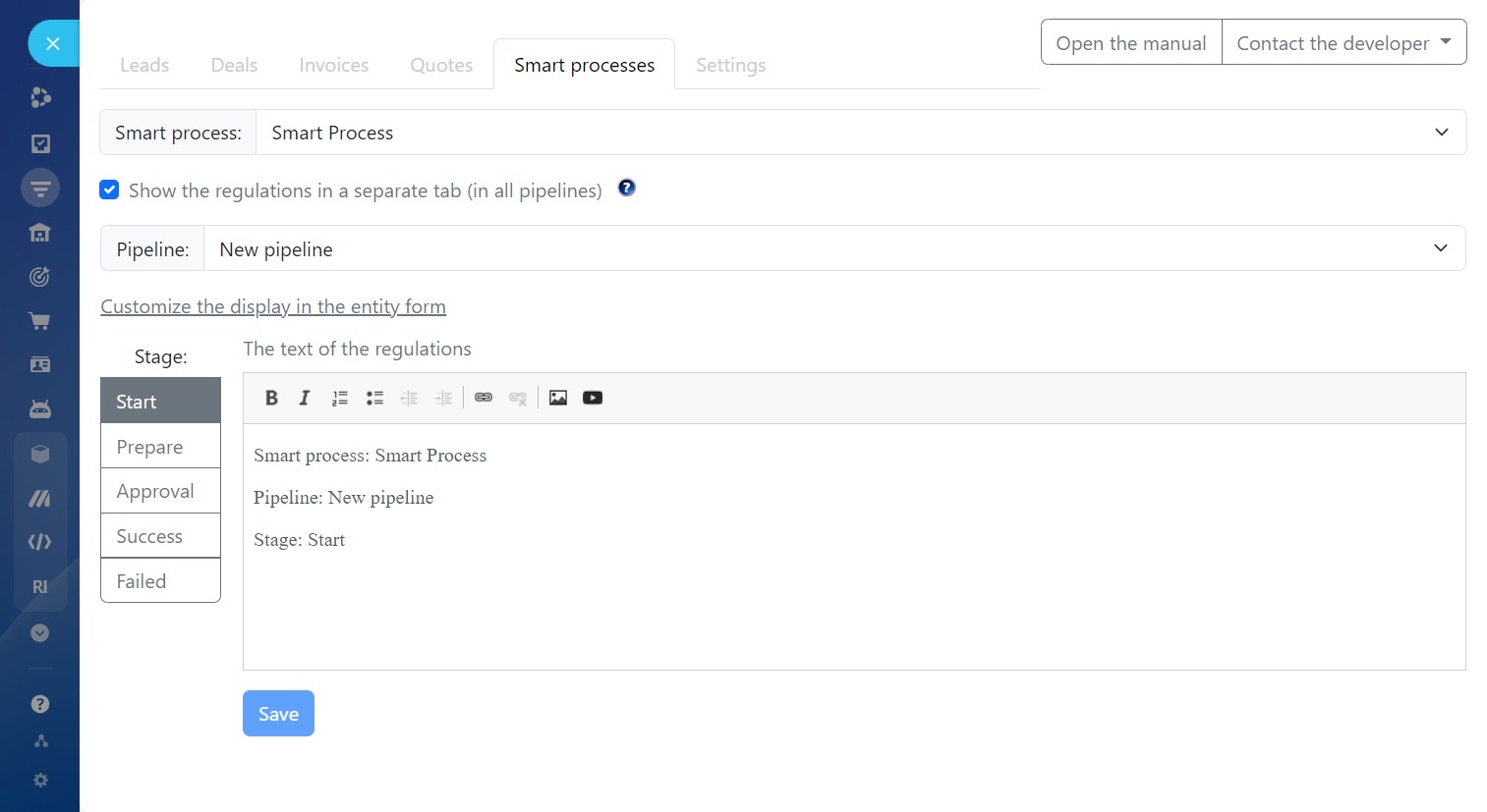The application displays the regulations of work in the Lead entity form, Deals entity form, Invoices and Quotes entity forms, as well as the Smart Process entity form. You can set up specific regulations for each stage. You can add pictures and videos to the text of the regulations.