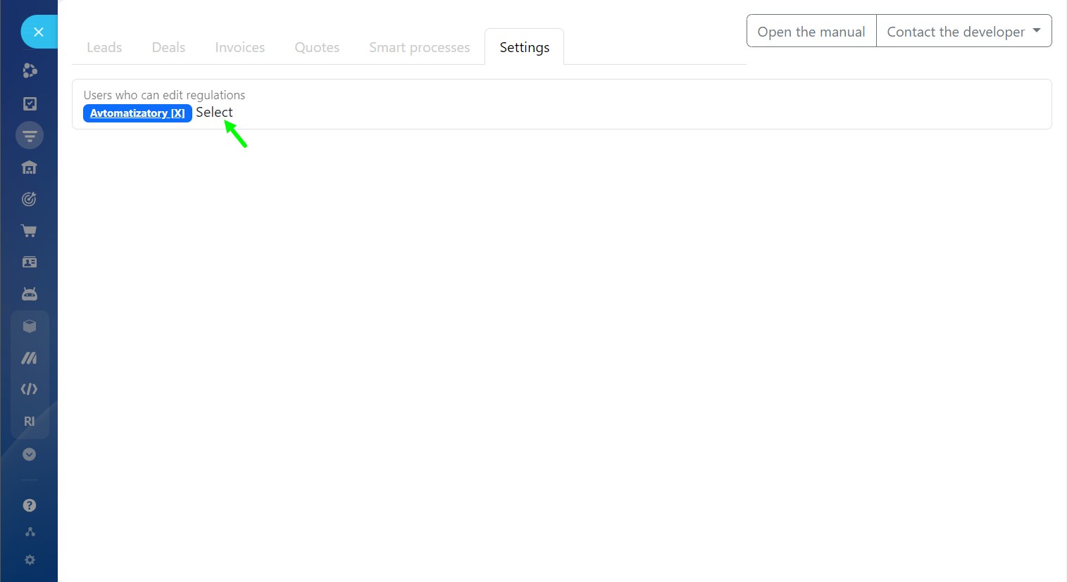 Setting up the display of the regulations in the Smart Process entity form as a field works for each pipeline separately.
