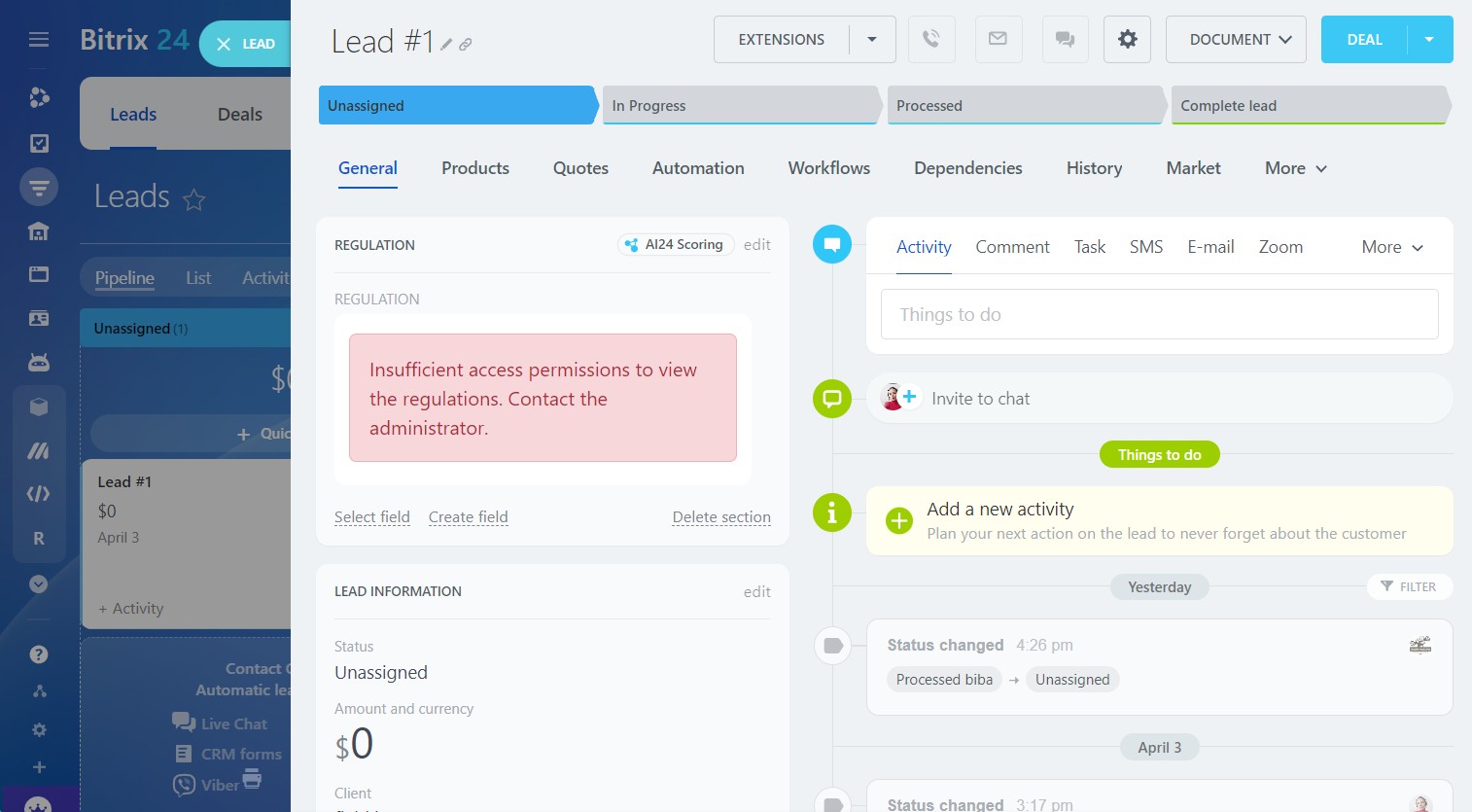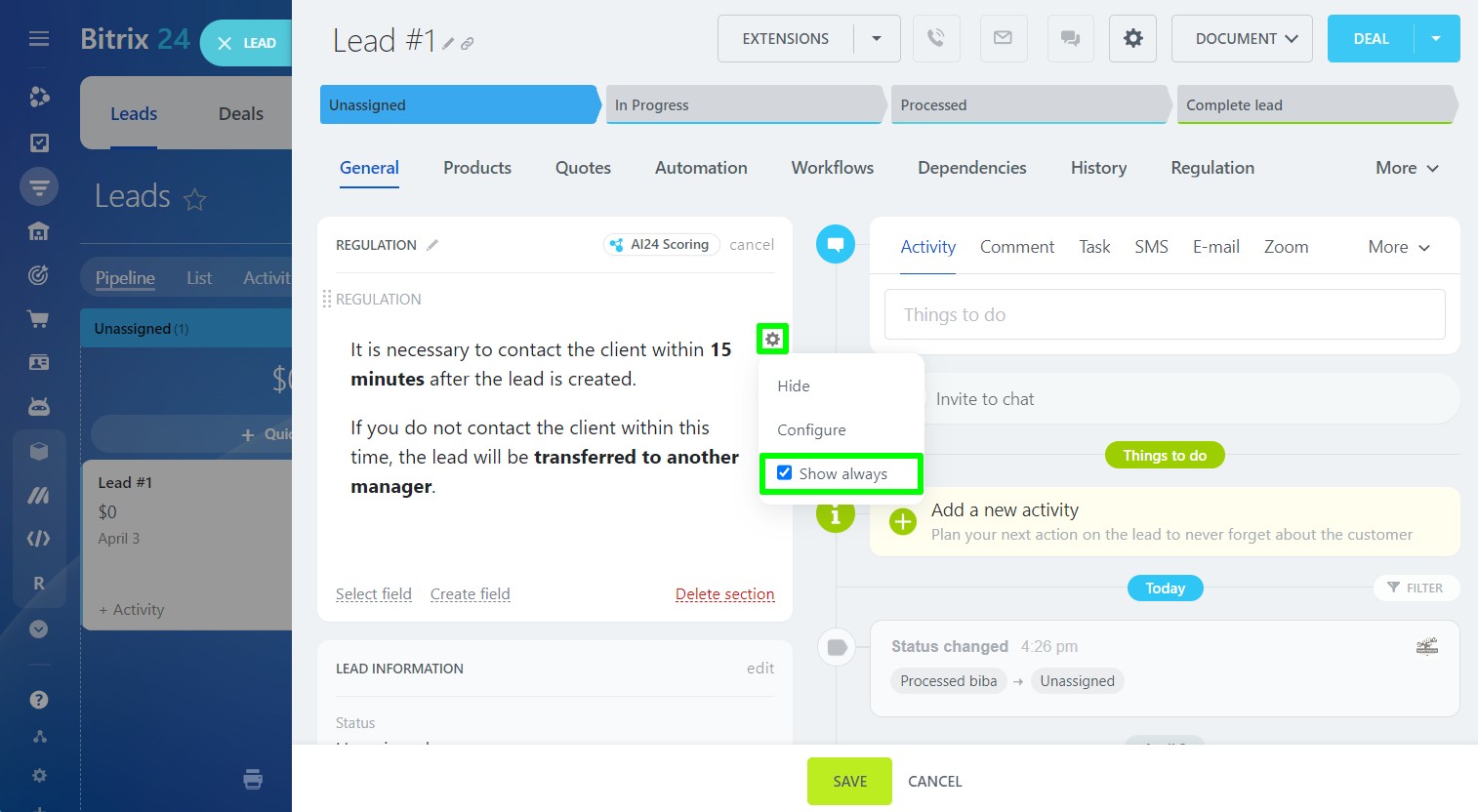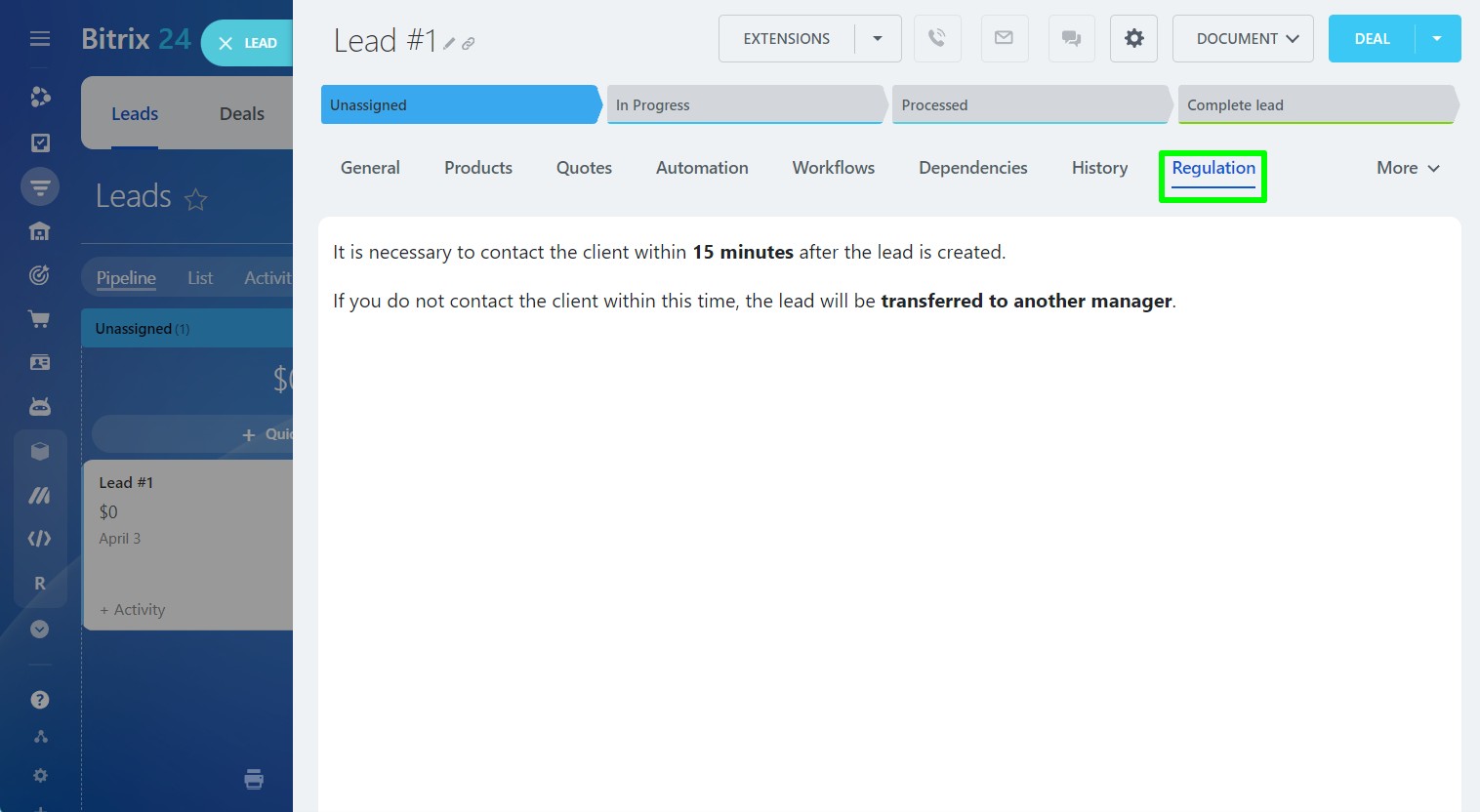 Using the application, you can display the work regulations in the Lead entity form, Deal entity form or Smart Process entity form.
