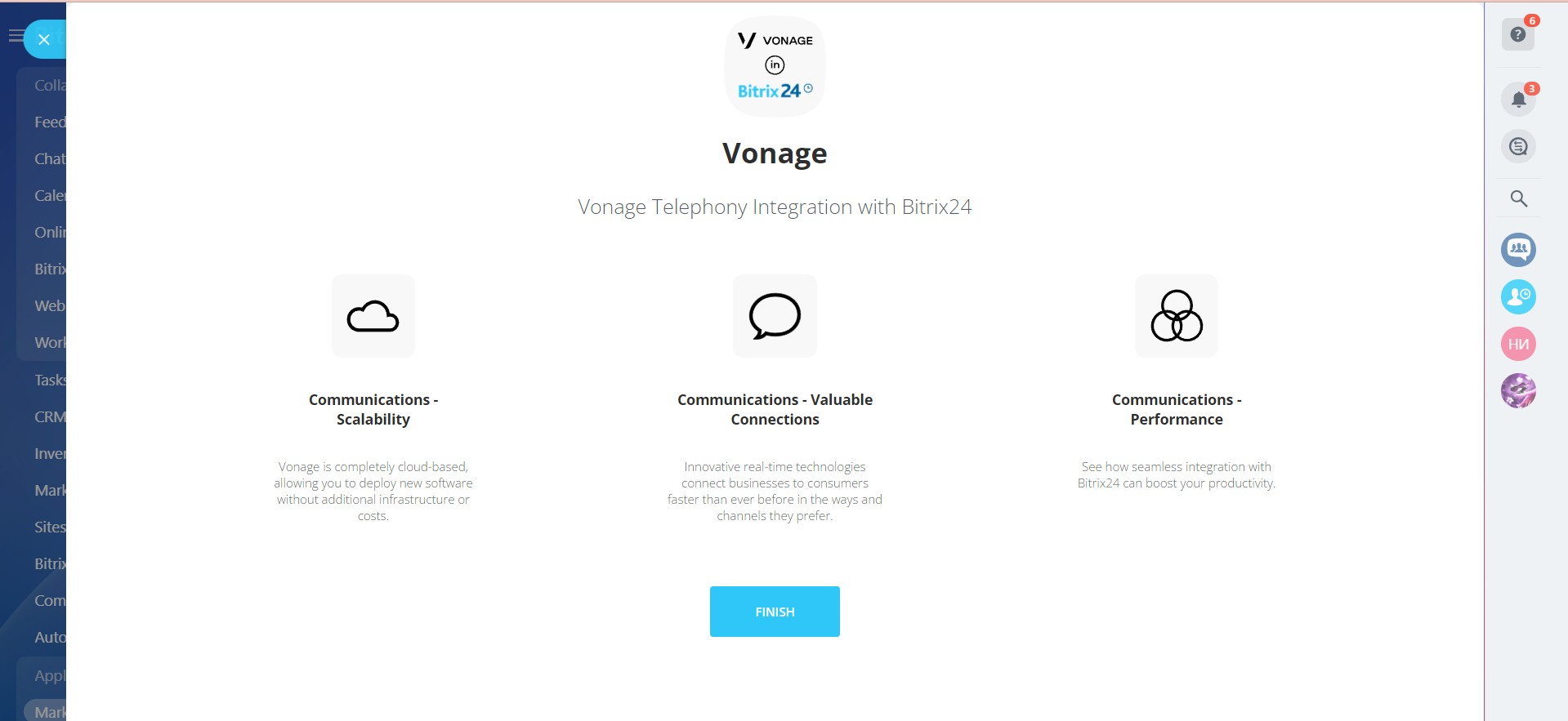 No more missed calls! Get all the advantages offered by Vonage telephony and Bitrix24! Your sale managers won't have to guess what clients are calling; now they are able to individually welcome them, access a complete communication history and concentrate on selling instead of data collecting.