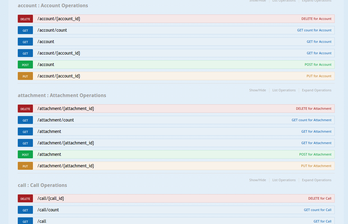 Accounts, Attachments, Calls, Contacts, CRMs, Emails, Events, Leads, Meetings, Notes, Opportunities, Tasks, Users. Check the list of all supported API Modules