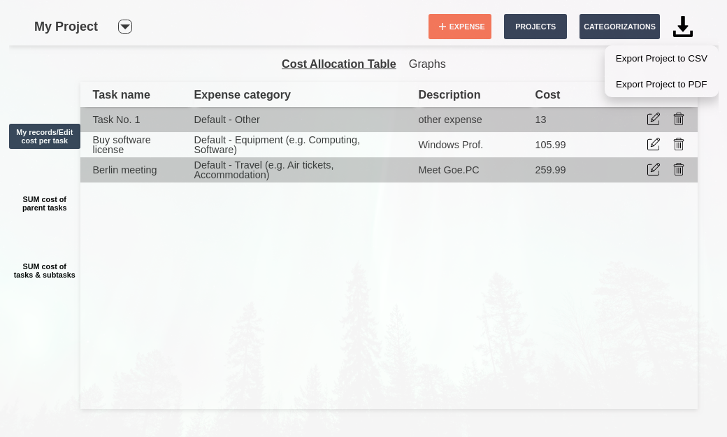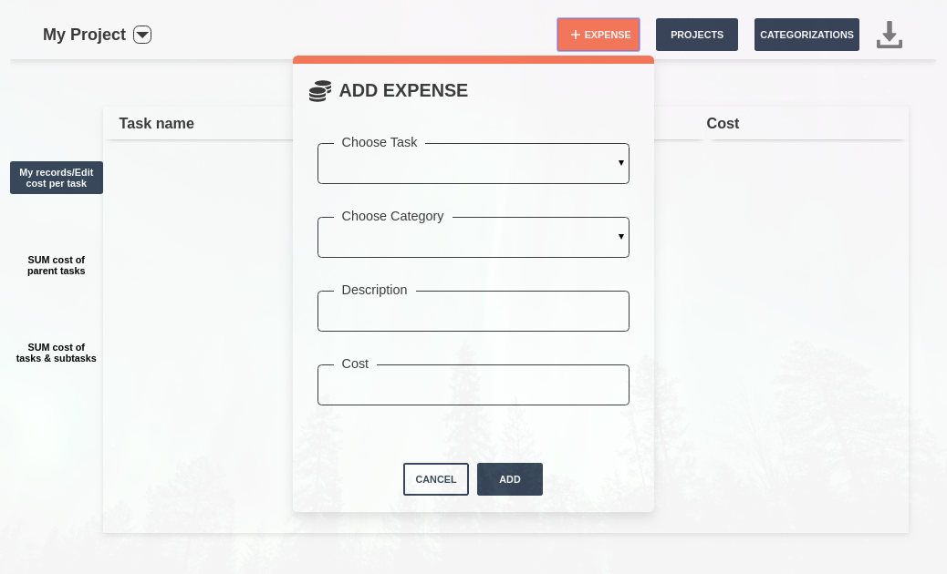 Project Expenses App is an essential tool that facilitates everyday project and expense management, by providing an easy way to connect the type of expenses and their respective cost with a specific project task. You can link a specific project together with expense categories by selecting “Add Project” and then add multiple expenses to this Project’s Tasks by selecting “Add Expense” for a specific task, cost and expense category.