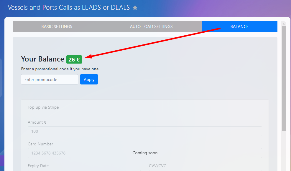 Welcome aboard! As a new user, we're delighted to offer you a promotional €26 balance, enabling you to create up to 20 leads/deals and load 20 vessels.