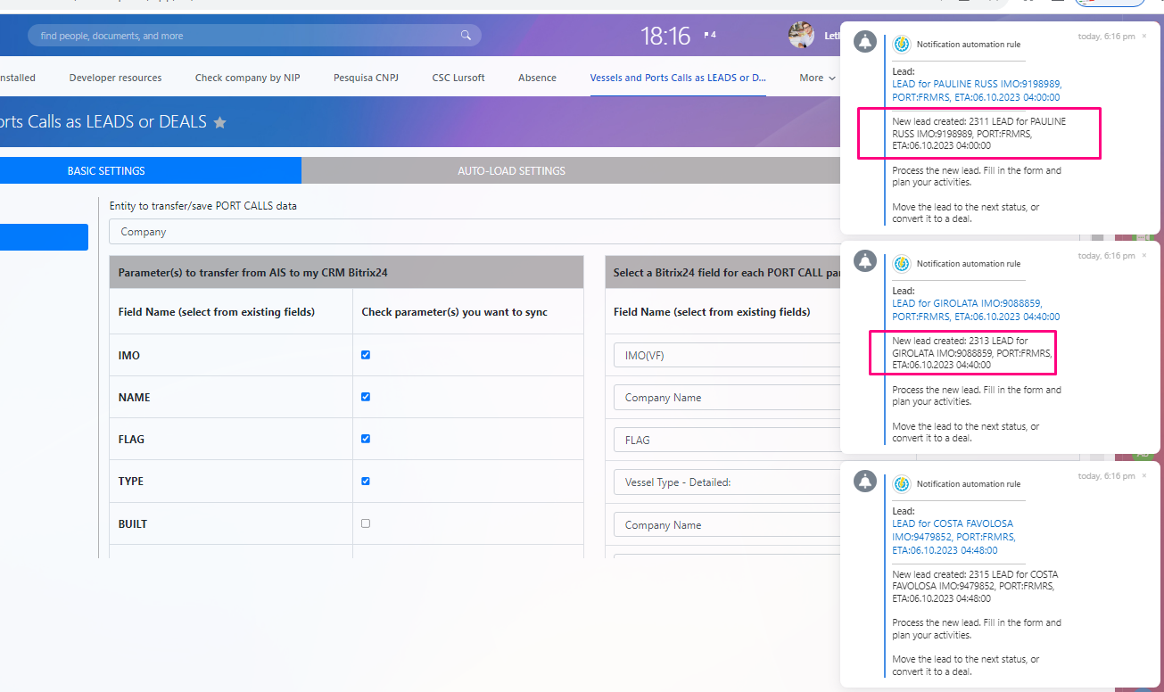 This application seamlessly integrates with your current (or new) Bitrix24 CRM system. Using our solution, you can automatically populate your CRM with leads, deals, contacts, and companies derived directly fr om real-time AIS data on ship movements and port calls.