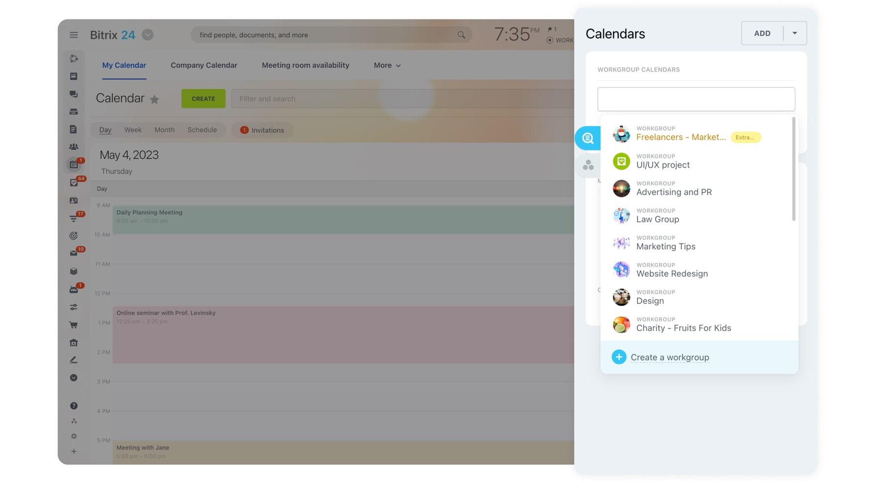 カレンダーはすべて1 箇所にまとめましょう。Bitrix24 では、カレンダーを作成して個人タスクをすべて管理できます。タスク管理にカレンダーを使用すると、期限とスケジュールを常時把握できます。会社やチーム限定で共有するカレンダーも作成できます。個人タスクの追跡、プロジェクトの進行状況のグループ化、カレンダー内でのチャットなど、チームコラボレーション機能も揃っています。Bitrix24 のカレンダーはモバイルアプリ内のどこからでもアクセスできますので、さらに便利です。会議を見逃す心配がなくなります。