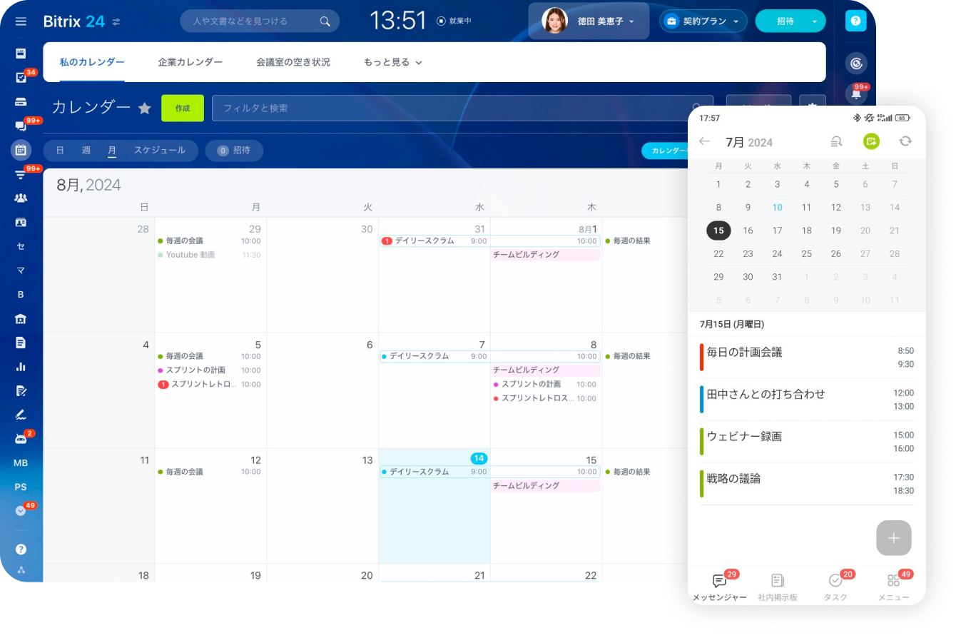 会議やイベントをスタイリッシュかつ簡単に開催し、1 日の計画を立てて作業負荷を管理しましょう。チームとのコミュニケーションや外部ユーザーとのコラボレーションも、すべてBitrix24で実現できます。