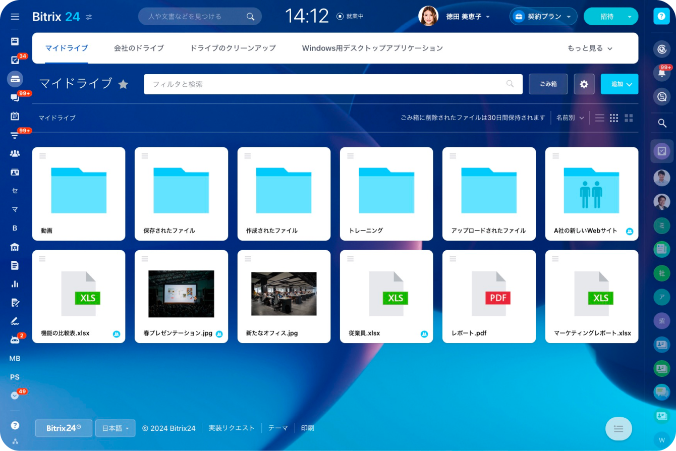 Bitrix24 ドライブは業務に関連するあらゆるファイルを作成、編集、共有できる場所です。任意のデバイスから簡単にアクセス可能で、Google ドキュメント、Office 365、および他の Bitrix24 の営業生産性ツールと統合できます。ファイルストレージに求められるすべてが備わっています。