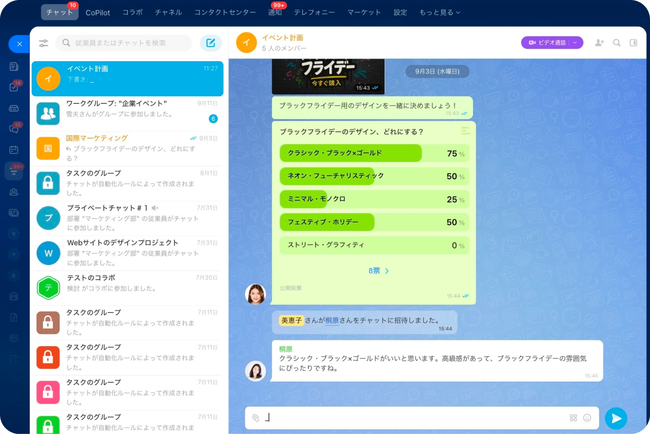 当社のメッセンジャーなら、サードパーティソリューションに頼らなくても会社内のすべてのコミュニケーションを安全に維持できます。チャットやチャネルの作成、投票の実施、コラボを介した外部ユーザー (フリーランサー、請負業者) とのやりとり、ファイル共有、リアクションが可能です。
