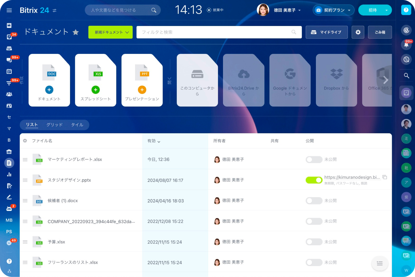 Bitrix24 内ではドキュメントのアップロード、作成、表示、同僚や外部ユーザーとの共有が可能です。すべての一般的なファイル形式をサポートしているため、プレーンテキストドキュメントだけでなく、スプレッドシートやプレゼンテーションも扱うことができます。