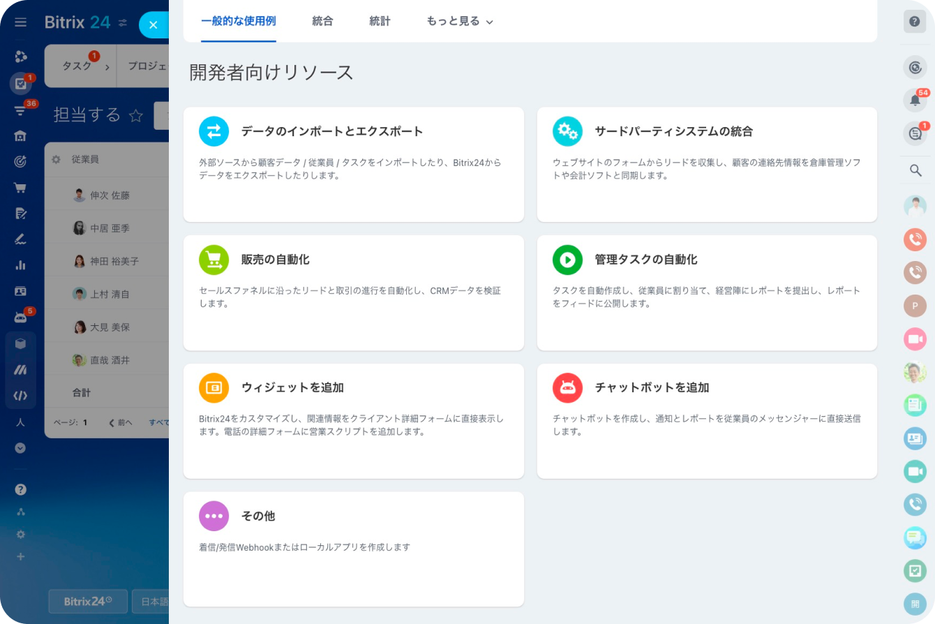 Bitrix24のREST APIは、タスク、ワークグループ、プロジェクト、データストレージ、カレンダー、およびその他の製品構成要素に対応しており、製品のカスタマイズや機能の強化に役立ちます。