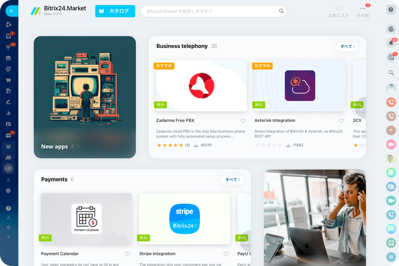 Bitrix24マーケットには、製品の機能やパフォーマンスを強化する便利なアプリ、アドオン、ソリューション、カスタムAPI統合機能が数多く揃っています。