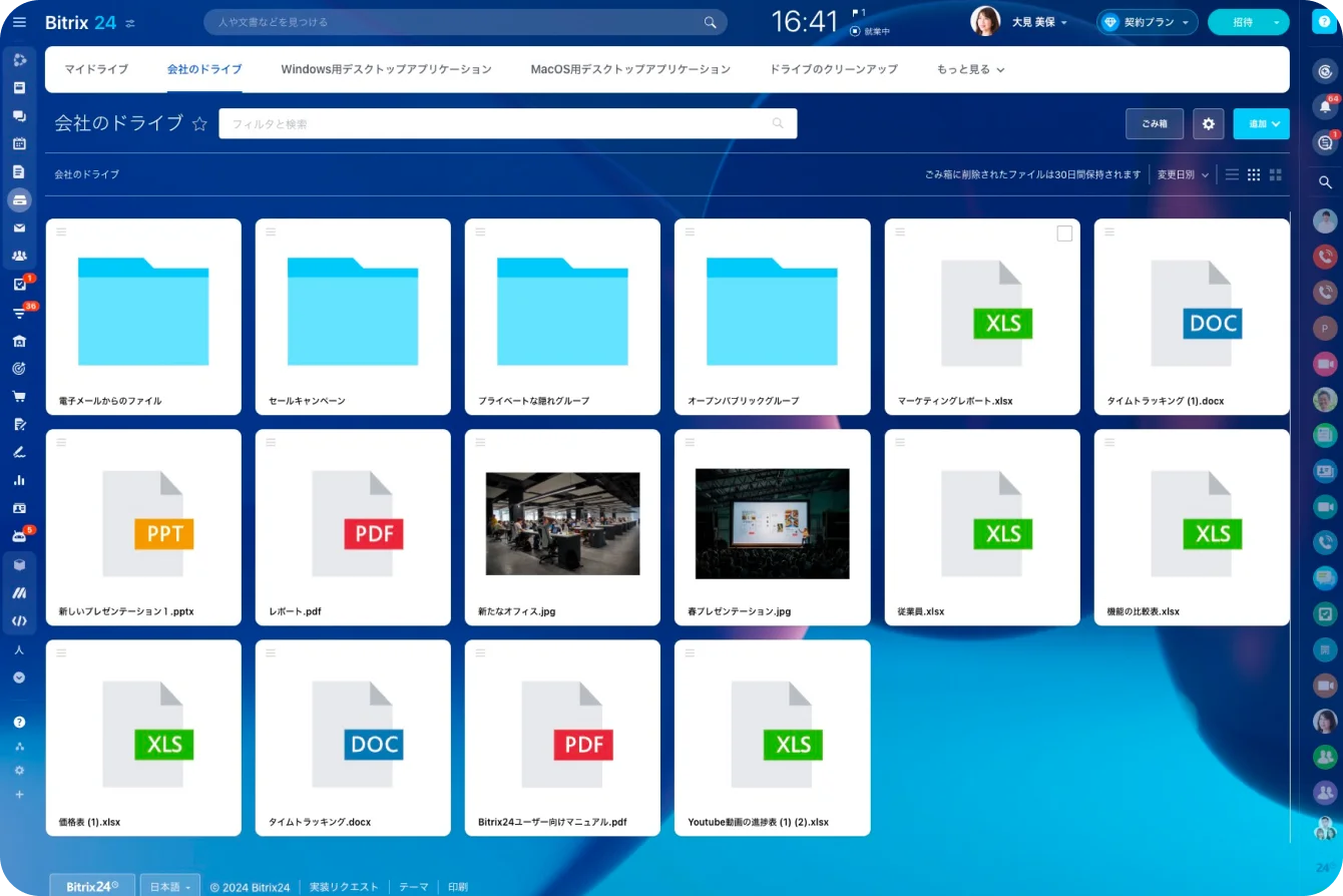 Bitrix24 は業務に関連するあらゆるファイルを作成、編集、共有できるクラウドファイルストレージを提供します。デスクトップからもモバイルデバイスからも簡単にアクセス可能で、Google ドキュメントや Office 365 と統合された Bitrix24 ドライブはオンラインのプロジェクトコラボレーションのニーズに最適です。